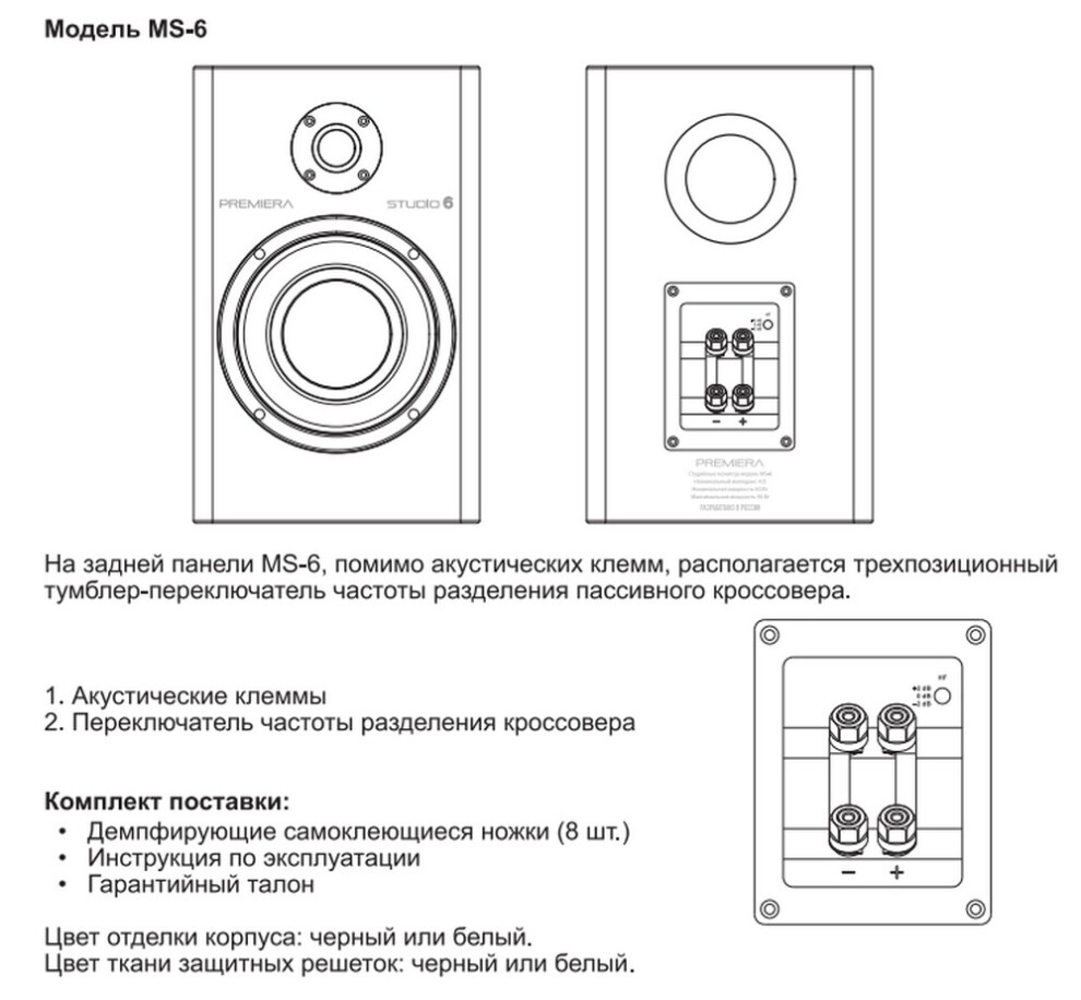 Premiera MS-6 «Studio 6» - полочные профессиональные акустические системы мониторного класса с феноменальной равномерностью звучания практически во всём диапазоне громкости. «Studio 6» предназначенные для использования в студиях звукозаписи, в качественных Hi-Fi-стереосистемах и в многоканальных системах домашнего кинотеатра любых конфигураций.