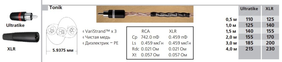 Как и первый тон в гамме, межблочный кабель Tonik создает основу для по-настоящему точного воспроизведения. Благодаря использованию легендарного трехпроводного плетения, технологии VariStrand™, проводников из сверхчистой меди и полиэтиленового диэлектрика, сделанного по нашему специальному рецепту, получается мощное, плавное и гармоничное звучание. Tonik для несимметричного соединения использует наш разъем RCA Ultratike™, а для балансного подключения – разъемы XLR студийного уровня с посеребренными контактами. Возможные варианты коннекторов: Ultratike™, WBT®-0114CU, XLR, 90 RCA.